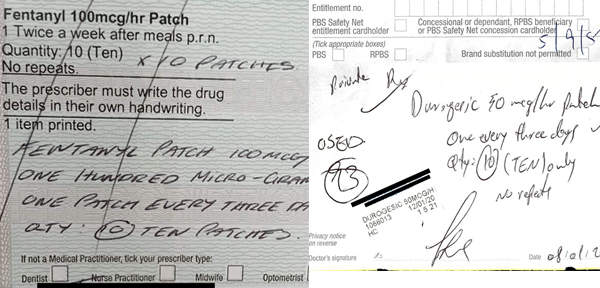There have been several confirmed reports of fraudulent handwritten and computer-generated prescriptions for Durogesic patches in varying strengths and quantities. The prescriptions look legitimate and have handwritten instructions fulfilling all legal requirements for prescriptions written in NSW.